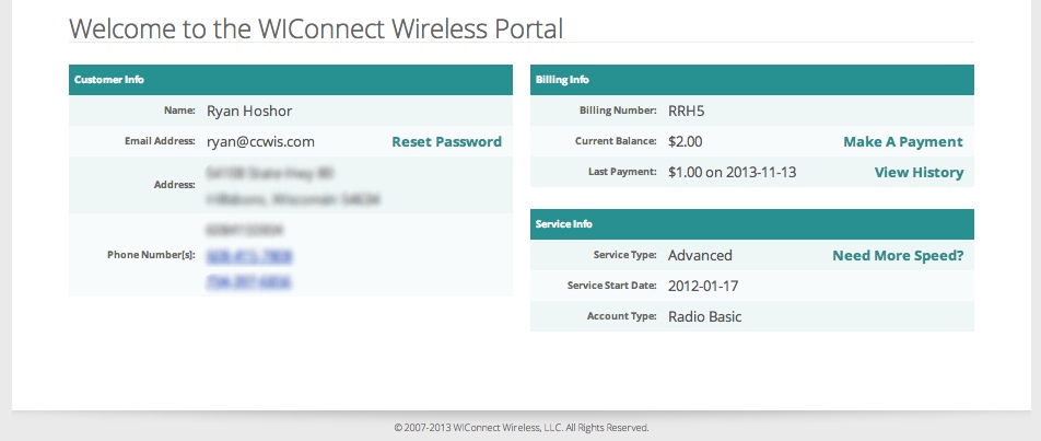 WIConnect Wireless has developed this portal to allow our customers easy access to their account information. You can view and print current and past invoices, and choose to pay open invoices online with a credit card using our authorize.net secure payment portal. Please review this document for help on how to access and use our current customer portal. If you have any questions please contact us at t608-524-1579 with any questions.